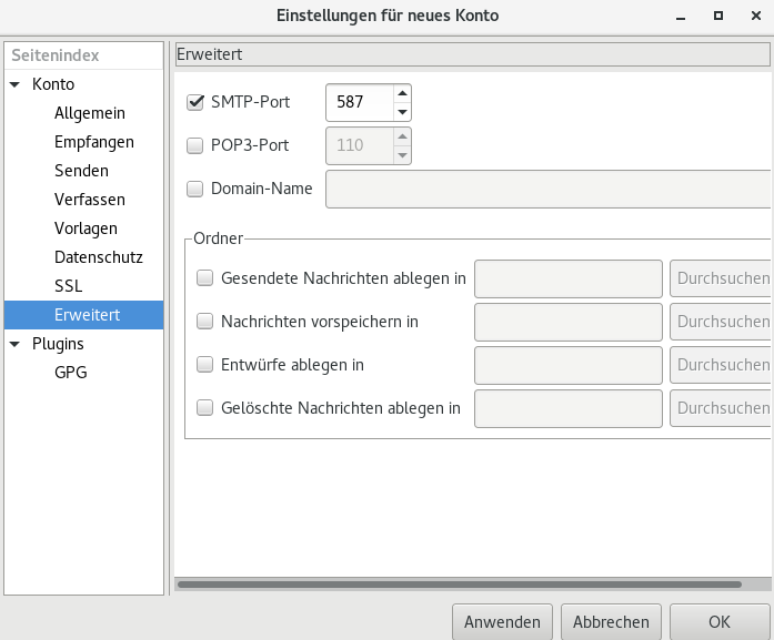 4. Erweitert – Ändere den SMTP-Port auf 587 (POP3 bleibt bei 110)