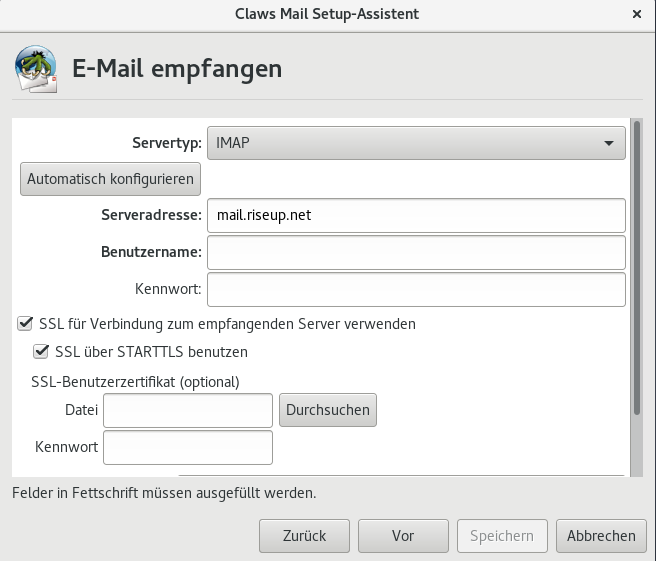 3. Wähle mail.riseup.net als “Serveradresse” (für IMAP und POP3)